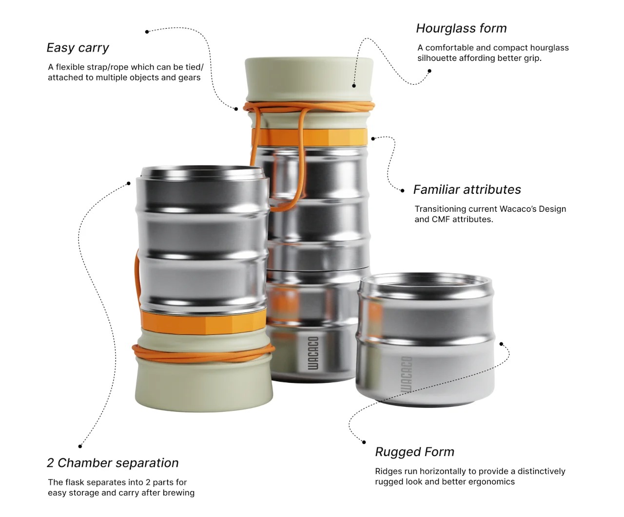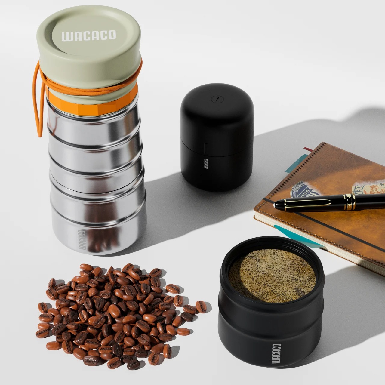 MokaMax是一款由设计师Somya Chowdhary打造的便携式压力咖啡机,其核心理念是“将完整的意式浓缩制作系统压缩至一个旅行杯中”。产品采用食品级不锈钢材质,外观为带防滑纹路的圆柱体,兼具旅行杯的便携性与咖啡机的功能。内部集成压力室、滤芯与活塞,通过旋转即可产生压力萃取咖啡,所有部件可倒置收纳,大幅简化了在户外或旅途中制作和携带咖啡的流程。